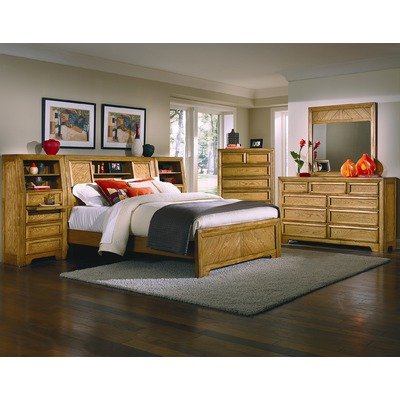 American Woodcrafters 94000-Bookcase Bed Bedroom Set Casual Home captures the contemporary style and charm of casual simplicity. Constructed of Albasia and Oak Veneers with drawer frames that function as drawer pulls. The warm casual finish gives a soft hue to the perimeter moldings on the dresser, chest, entertainment center and night stand. The panel headboard, with low footboard, features a chevron oak pattern which confirms the casual contemporary styling. Features: -Set includes bookcase headboard bed and nightstand. -Casual Home collection. -Warm Casual Oak finish. -Available in Queen or King sizes. -Albasia solids and oak veneer construction. -Contemporary style. -Canted frame with mitered top corners albasia solids. -Chevron planked oak veneer panel flat cut oak veneer faces with vain lines. -Center upright. -Base rail with shaped cut away albasia solids. -Low rail position. -Sand break all edges. -Interior bolt on rail system. -Three slats. -Three support legs with adjustable foot. -Bookcase headboard has three grommets for wire management. -headboard has three openings with one stationary partition 12" high opening and 2 adjustable. -headboard has sliding doors. -Headboard has base assembly base is covered to 16" off floor. -Headboard has finished interiors and oak veneer back panel. -Nightstand has three drawers with oak veneer faces with oak veneer edges on all four sides, albasia solid molding on the face of the drawer fronts. -Dust panel on bottom drawer. -Canted case frame with mitered top corners. -Case top oak face veneer and oak veneer edges on all four sides. -Framed up end panels. -Tip resistant furniture safety bracket. -Four sided drawer box with English dovetails front and back finished drawer interiors. -Additional slats provide extra support. -Assembly required. -Manufacturer provides one year warranty from ship date.