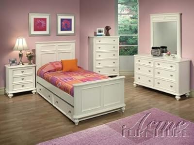 Athena White Finish Twin Bedroom Set by Acme The Athena girl's bedroom collection features shaped and profiled Head/Footboard with accommodating trundle. Also features complementary cases reflecting decorative glass knob hardware and Antique White finish throughout. This beautiful girl's bedroom set is perfect for your favorite girl. Mattresses not included. The 5-Pc Set includes 1 Twin Bed, 1 Nightstand, 1 Drawer Chest, 1 Dresser and 1 Mirror. The 6-Pc Set includes 1 Twin Bed, 1 Trundle, 1 Nightstand, 1 Drawer Chest, 1 Dresser and 1 Mirror. Features: Transitional Style Antique White Finish Raised Panel Detailing Decorative Turned Feet Decorative Round Glass Knobs Also Available in Full Size Twin Size Trundle (Optional) Mattresses Not Included Assembly Required Ships Via Freight Dimensions: Headboard Height - 50" H Nightstand Size - 26" W x 16" D x 28" H Ches