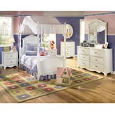 We have the best ratings ! Compare our ratings to our competitors. This French styled youth collection has a luminous white finish. The drawers are framed with a decorative emboss. The hardware is a satin nickel color and acrylic accentuated with detail. Ample shape can be found throughout in the valances, crowns, base strips and more. Appliques and rosettes provide additional detail. 4-piece set includes bed headboard, footboard and rails, nightstand, dresser and mirror Matching Tall Chest, 3-Drawer Chest, Desk, Desk w Hutch, Underbed Storage, lamps, rug, top of bed and additional nightstand available With the exquisite beauty of formal French style brought to life within a country motif, the Exquisite Youth Sleigh Bedroom Set by Signature Design is sure to create a sense of magic and wonder to any child's bedroom. With a luminous white finish flowing smoothly over the decorative embossing and beautifully turned detailing, this furniture is perfectly designed for any little girl's